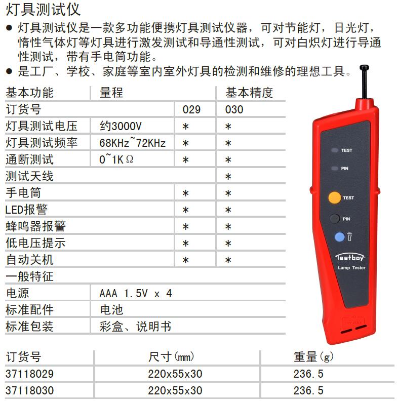 订货号 制造商型号 灯具测试电压量程 灯具测试频率量程 通断测试 测试天线 手电筒 LED报警 蜂鸣器报警 低电压提示 自动关机 电源 标准配件 标准包装 重量 价格 购物车