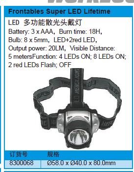 ·电池:3倍AAA,燃烧时间:18H,灯泡:8x5mm,LED+2redLED,输出功率:20LM,可见距离功能:4个led打开;8个led;2红色led闪烁;