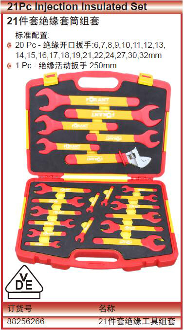 ·物美价廉,且很是耐用的产品 ·标准配置: ·20Pc-绝缘开口扳手:6,7,8,9,10,11,12,13, ·14,15,16,17,18,19,21,22,24,27,30,32mm ·1Pc-绝缘活动扳手250mm