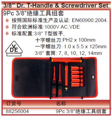 ·按照国际标准生产及认证:EN60900:2004. ·符合欧洲标准:1000VAC.VDE ·标准配置:3/8″T型扳手, ·十字螺丝刀:PH2×100mm ·一字螺丝刀:1.0×5.5×125mm ·3/8″套筒:7,8,10,12,14mm