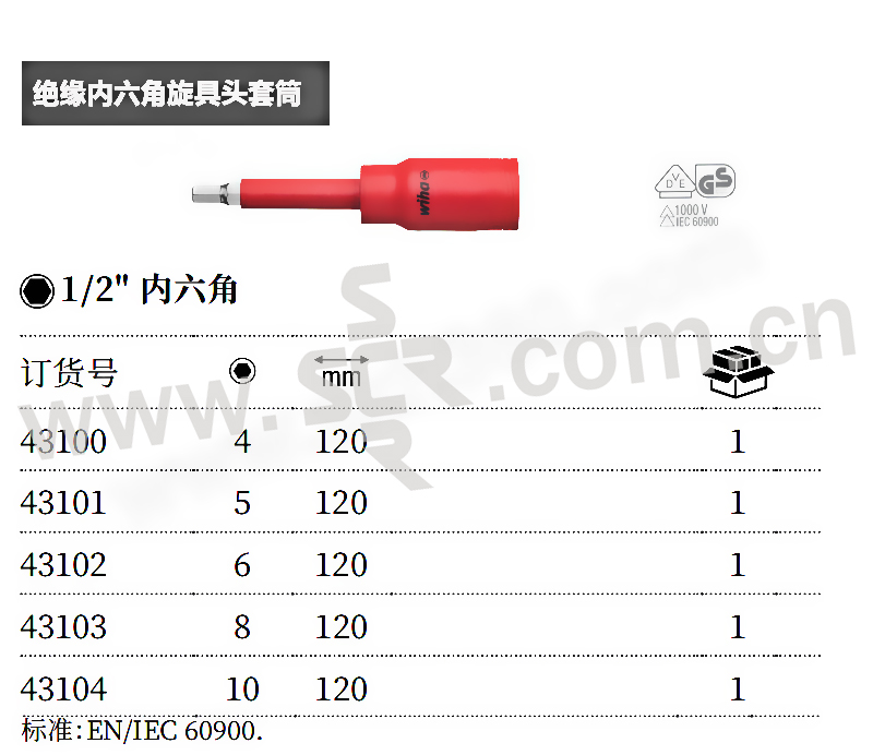 WIHA/威汉 1/2"绝缘内六角旋具头套筒 43100 4×120mm 1件