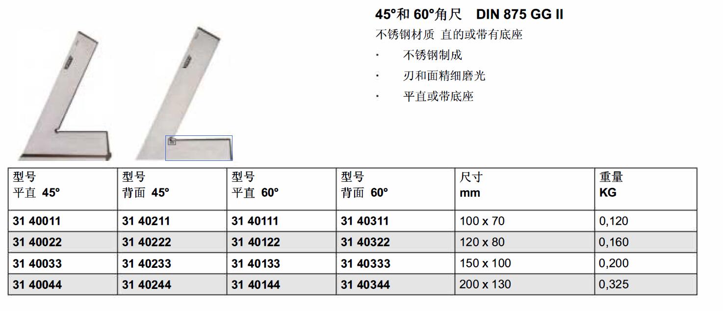 ·45° 和60°角尺 DIN 875 GG II 不锈钢材质直的或带有底座不锈钢制成 ·刃和面精细磨光平直或带底座