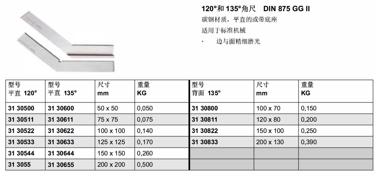 ·120° 和135°角尺 DIN 875 GG II 不锈钢材质. ·平直的或带底座 ·适用于标准机械边与面精细磨光