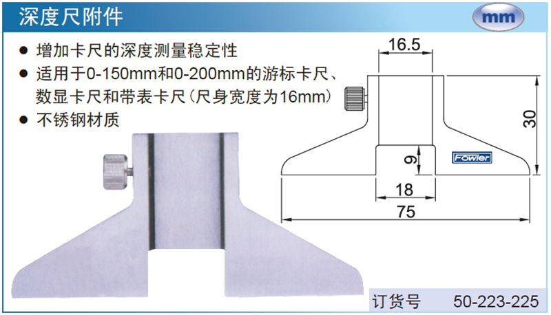 ·增加卡尺的深度测量稳定性 ·适用于0-150mm和0-200mm的游标卡尺、 数显卡尺和带表卡尺(尺身宽度为16mm) ·不锈钢材质