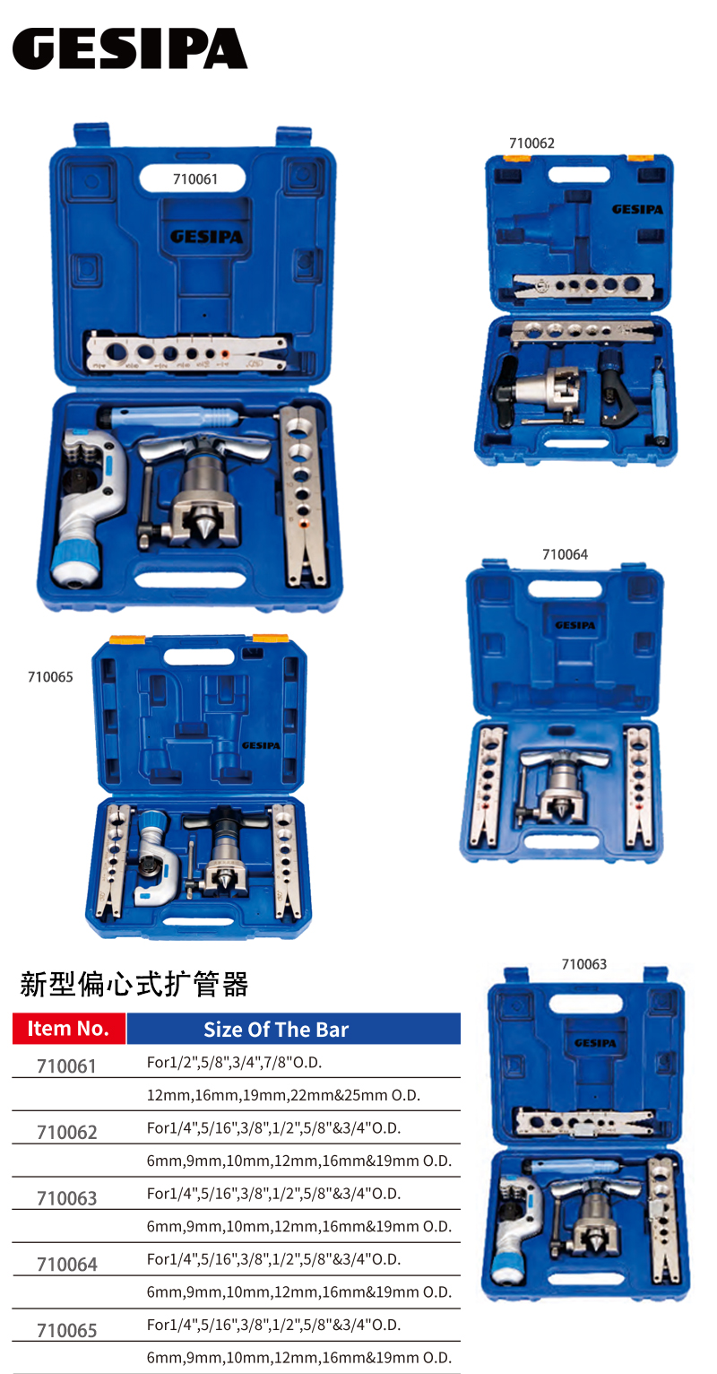 ·易操作,省时省力; ·特殊偏心式旋转将管的内部逐渐阔开形成一个精确有规则的45°喇叭口而不下滑,扩展的喇叭面会更平滑,平整而没有刮伤; ·扩管工作完成时,偏心式圆锥头会自动弹起,这时让圆锥头再回旋1-2次,由此产生的摩擦会使喇叭口更加光滑和美观。