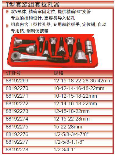 ·双V形体,精确牢固定位,提供精确90°支管专业的挂钩设计,更容易导入钻孔组套内含:T型拉孔器,专用棘轮扳手,定位钳,自动专用钻,钢制便携箱