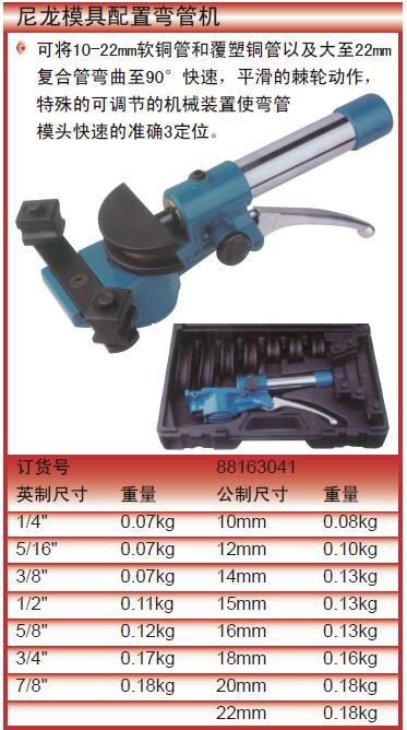 ·可将10-22mm软铜管和覆塑铜管以及大至22mm复合管弯曲至90°快速,平滑的棘轮动作,特殊的可调节的机械装置使弯管模头快速的准确3定位。
