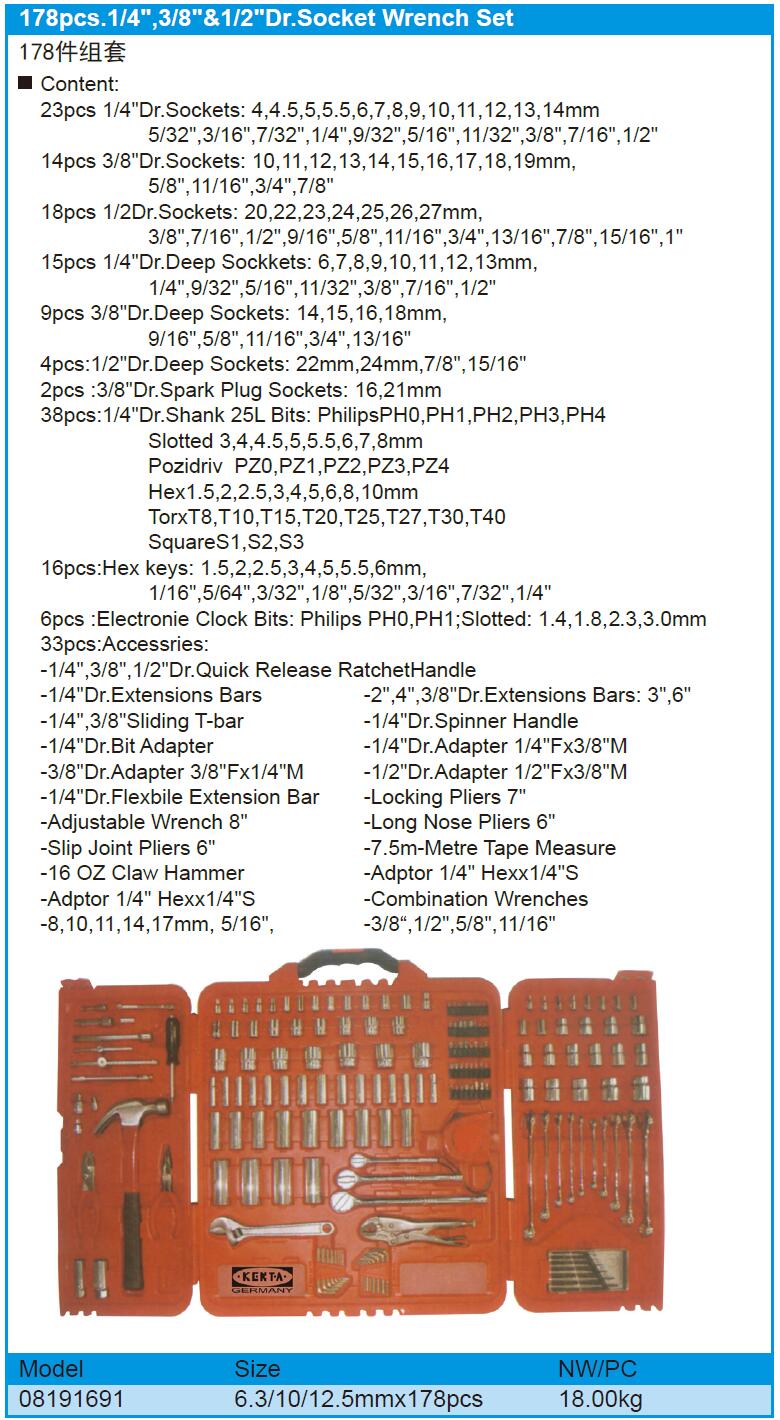 178pcs.1/4",3/8"&1/2"Dr.Socket Wrench Set