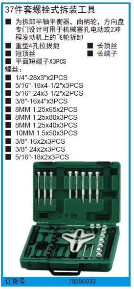 ·为拆卸半轴平衡器,曲柄轮,方向盘专门设计可用于机械塞孔电动或2冲程发动机上的飞轮拆卸 ·重型4孔拉拔扼,长顶丝,短顶丝,长端子平面短端子X3PCS螺丝: ·1/4"-28x3"x2PCS ·5/16"-18x41/2"x3PCS ·5/16"-24x31/2"x2PCS ·3/8"-16x4"x3PCS ·8MM1.25x65x2PCS ·8MM1.25x80x3PCS ·8MM1.25x40x3PCS ·10MM1.5x50x3PCS ·3/8"-16x2x3PCS ·3/8"-24x2x3PCS ·