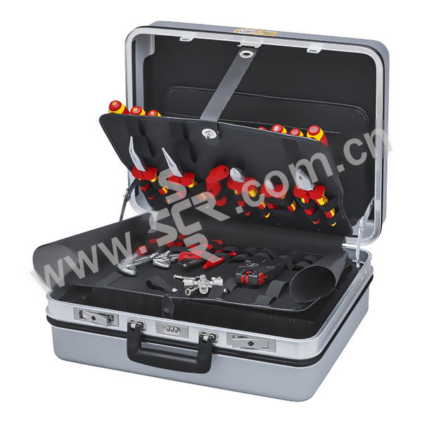 ·含有23件优质工具,绝缘部分的工具经VDE测试,符合DIN EN/IEC60900 1000V标准。 ·耐磨ABS硬壳材质,用铝架和围衬加固。 ·设有文件袋和笔插。 ·工具固定薄板可拆卸,在两侧有弹力松紧带。 ·另有1个不可拆卸的工具固定薄板,并附有弹力松紧带和工具保护衬布。 ·内部尺寸:420×320×85mm。 ·安全坚固的金属锁和3个数码锁。 ·坚固的,符合人