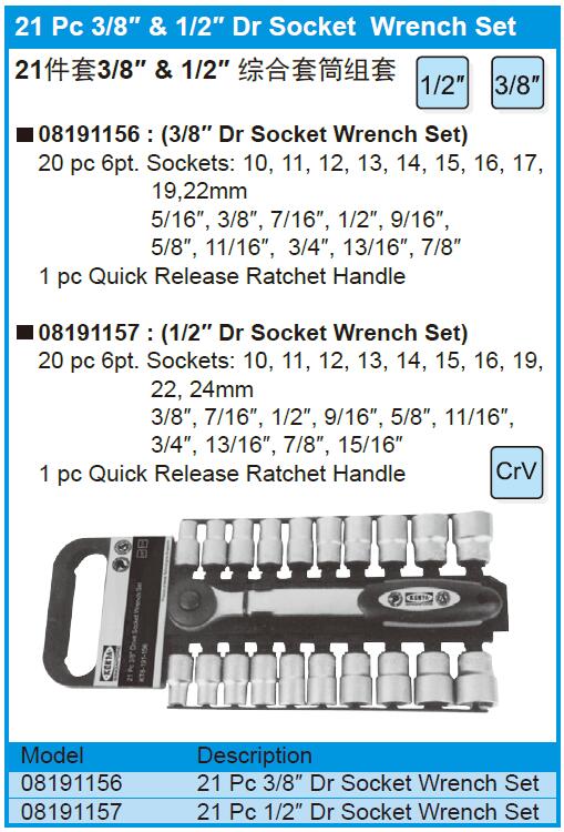21 Pc 3/8″ & 1/2″ Dr Socket Wrench Set