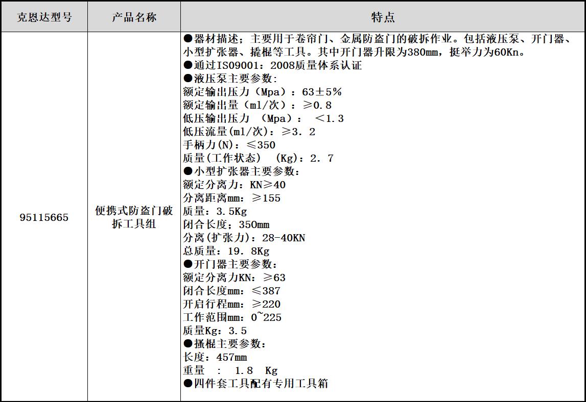 ·主要用于卷帘门,金属防盗门的破拆作业.包括液压泵,开门器,小型扩张器,撬棍等工具 ·通过IS009001:2008质量体系认证