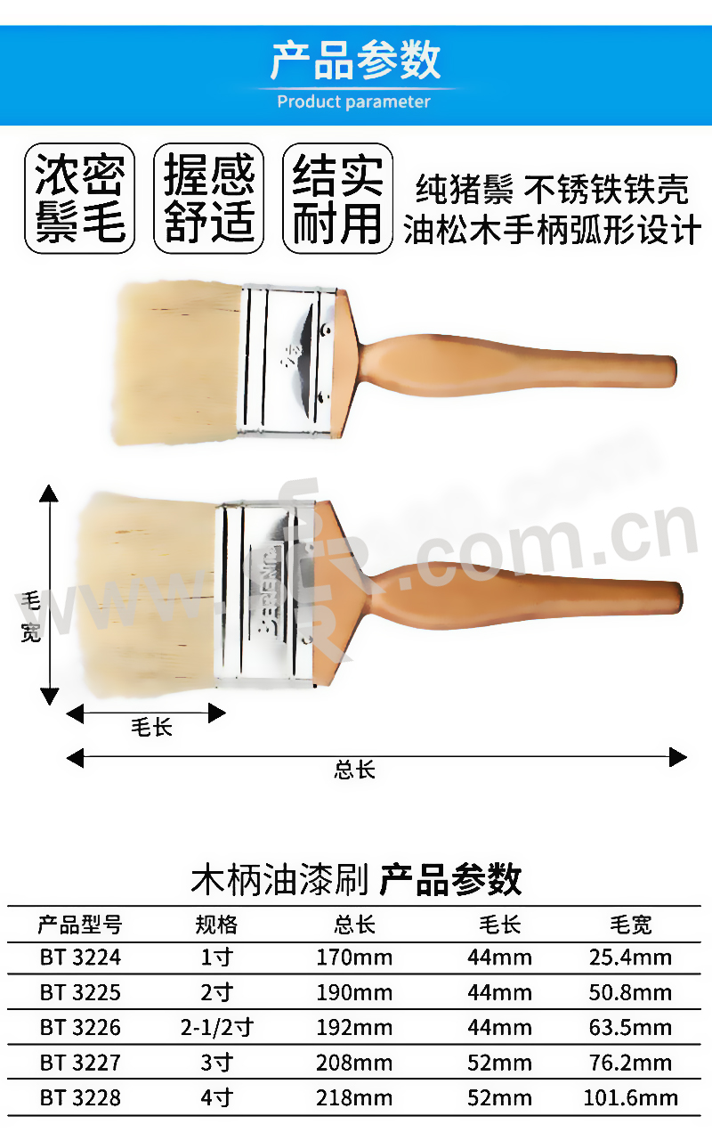 ·100%普通全猪鬃,铁壳为不锈铁·油松木手柄,握感更舒适。
