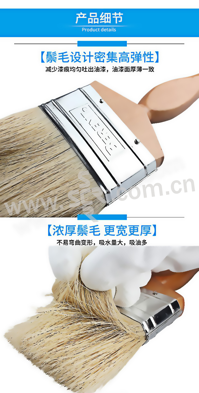 ·100%普通全猪鬃,铁壳为不锈铁·油松木手柄,握感更舒适。