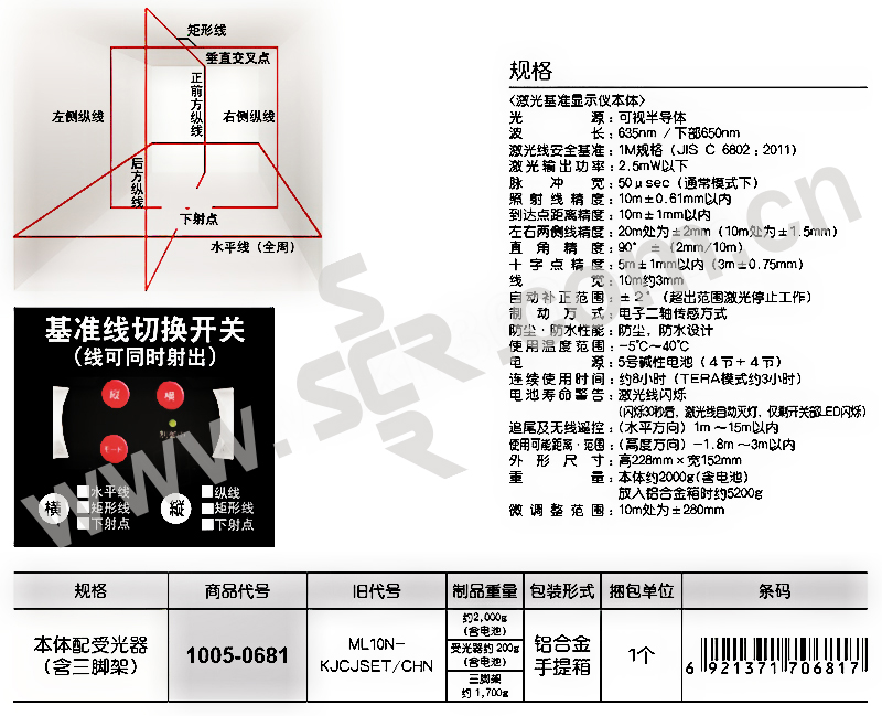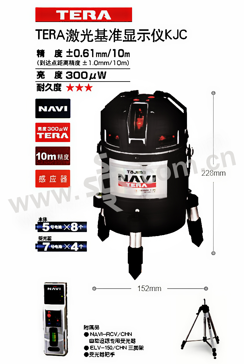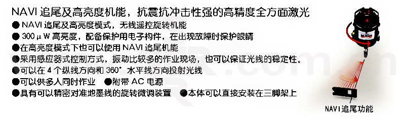 ·TERA高亮度机能,亮度是一般的两倍。 ·NAVI追尾机能。 ·用一台激光基准显示仪,可射出矩形、两垂直、地墨、水平、垂直交叉点等基准线。 ·采用LD的下射点,放置在三脚架上也可以清晰看到下射点。 ·采用半导体激光,小型轻巧,便于携带。 ·具有可以精密对准地墨线的回转微调装置。 ·具有旋转微调功能,可以精密调整下射点。 ·能够防止作业现场显示振动。 ·本激光产品可直接按装在专用三脚架上使用。