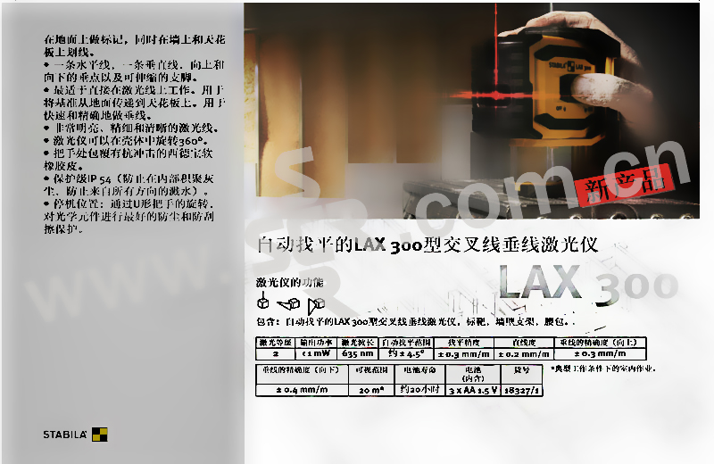 ·一条水平线,一条垂直线,向上和向下的垂点以及可伸缩的支脚。·适于直接在激光线上工作。用于将基准从地面传递到天花板上。用于快速和精确地做垂线。·非常明亮、精细和清晰的激光线。·激光仪可以在壳体中旋转360°。·把手处包覆有抗冲击的西德宝软橡胶皮。·保护级IP 54(防止在内部积聚灰尘,防止来自所有方向的溅水)。