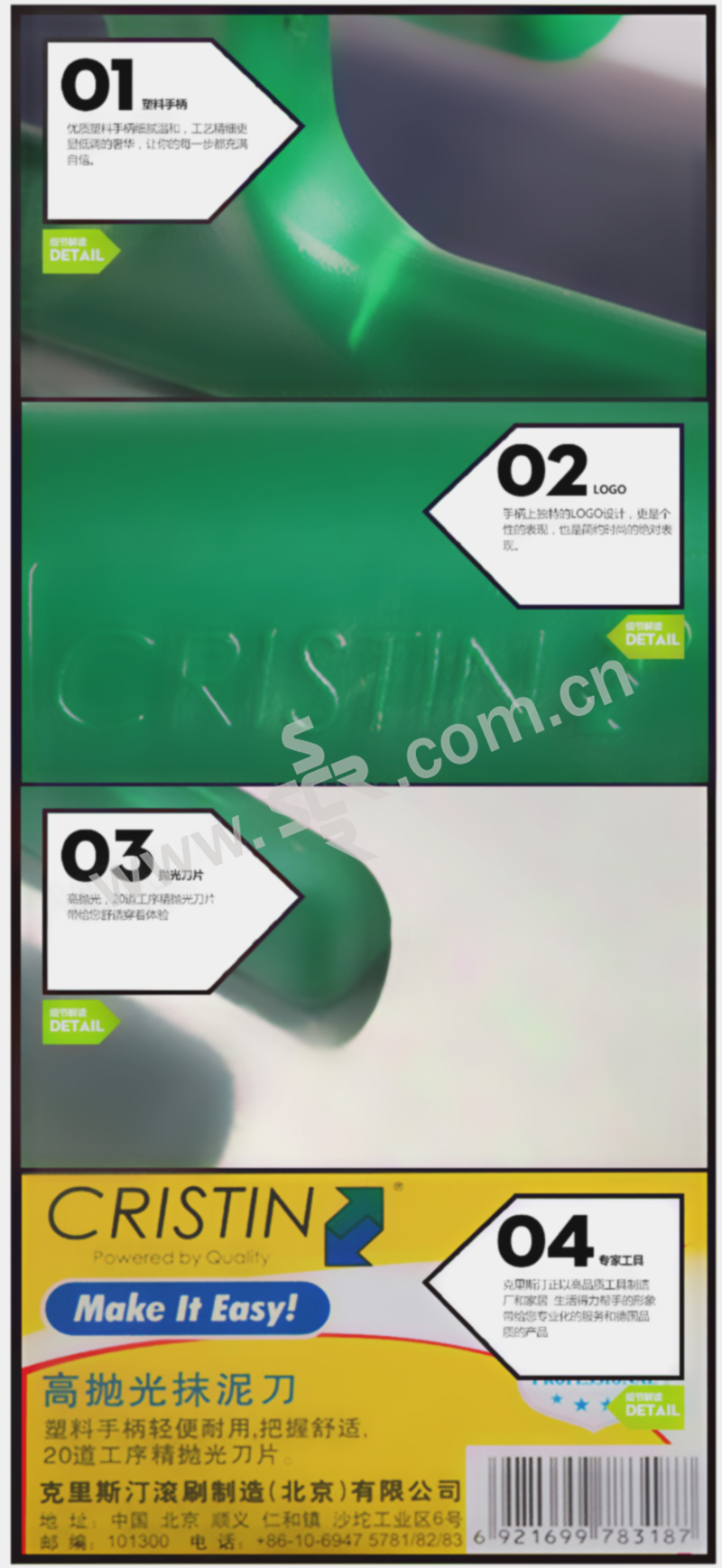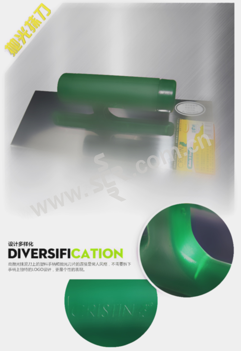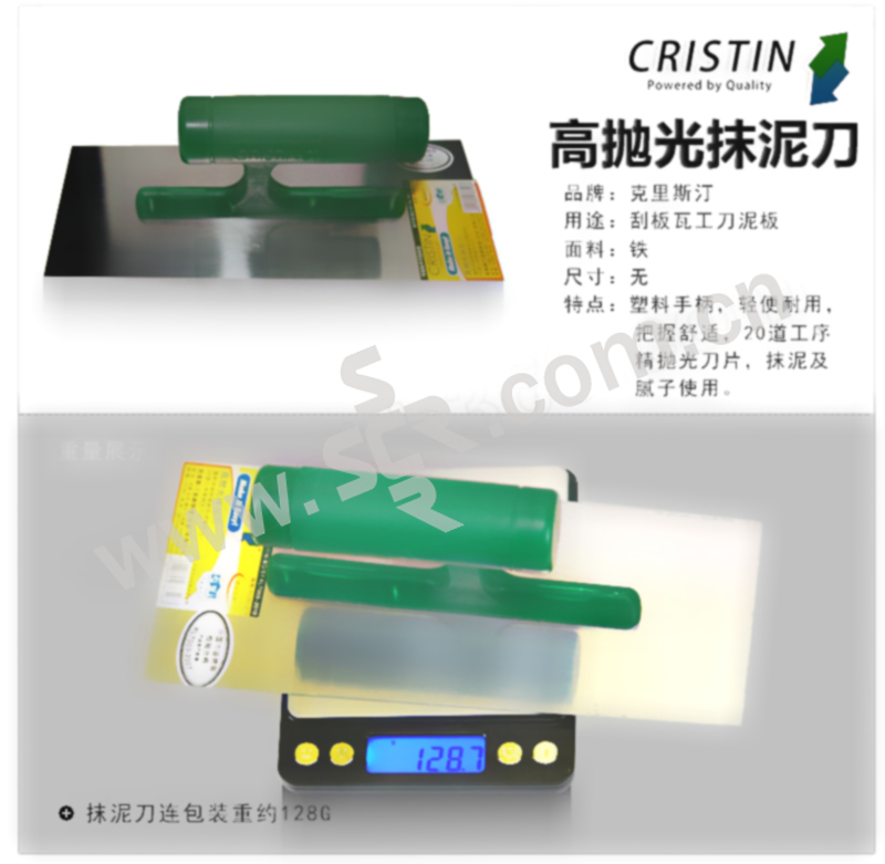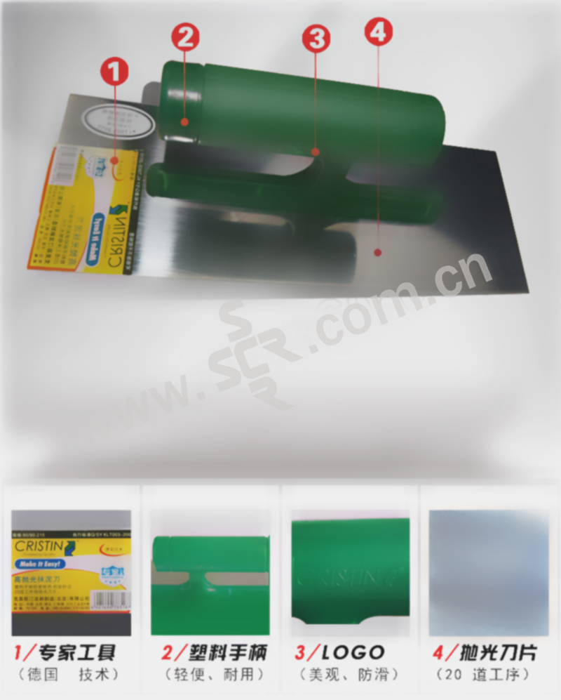 ·塑料手柄,轻便耐用,把握舒适,20道工序精抛光刀片,抹泥及腻子使用。
