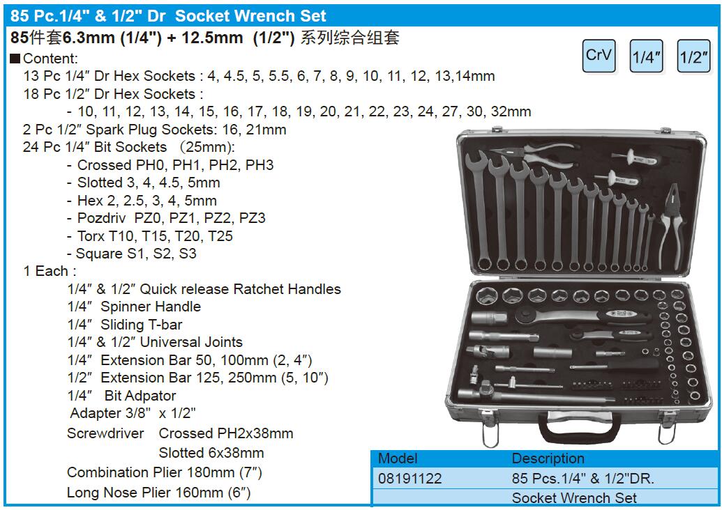 85 Pc 1/4" & 1/2" Dr Scoket Wrench Set