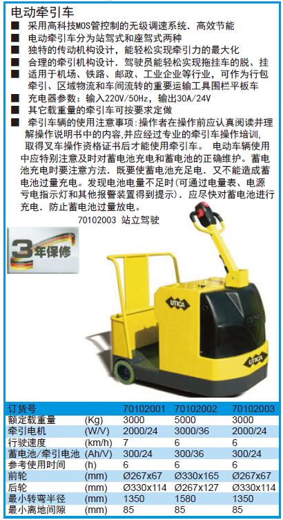 ·适用于机场、铁路、邮政、工业企业等行业,可作为行包牵引、区域物流和车间流转的重要运输工具围栏平板车充电器参数:输入220V/50Hz,输出30A/24V其它载重量的牵引车可按要求定做牵引车辆的使用注意事项:操作者在操作前应认真阅读并理解操作说明书中的内容,并应经过专业的牵引车操作培训,取得叉车操作资格证书后才能使用牵引车。