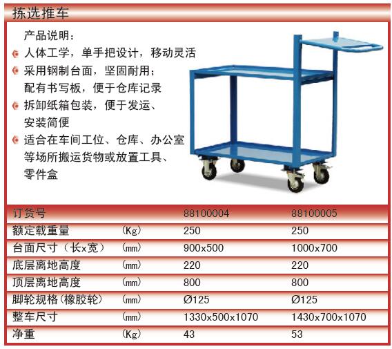 订货号 制造商型号 产品类型 额定载重 台面尺寸(长×宽) 底层离地高度 顶层离地高度 顶层离地高度 脚轮规格(橡胶轮) 整车尺寸 净重 价格 购物车