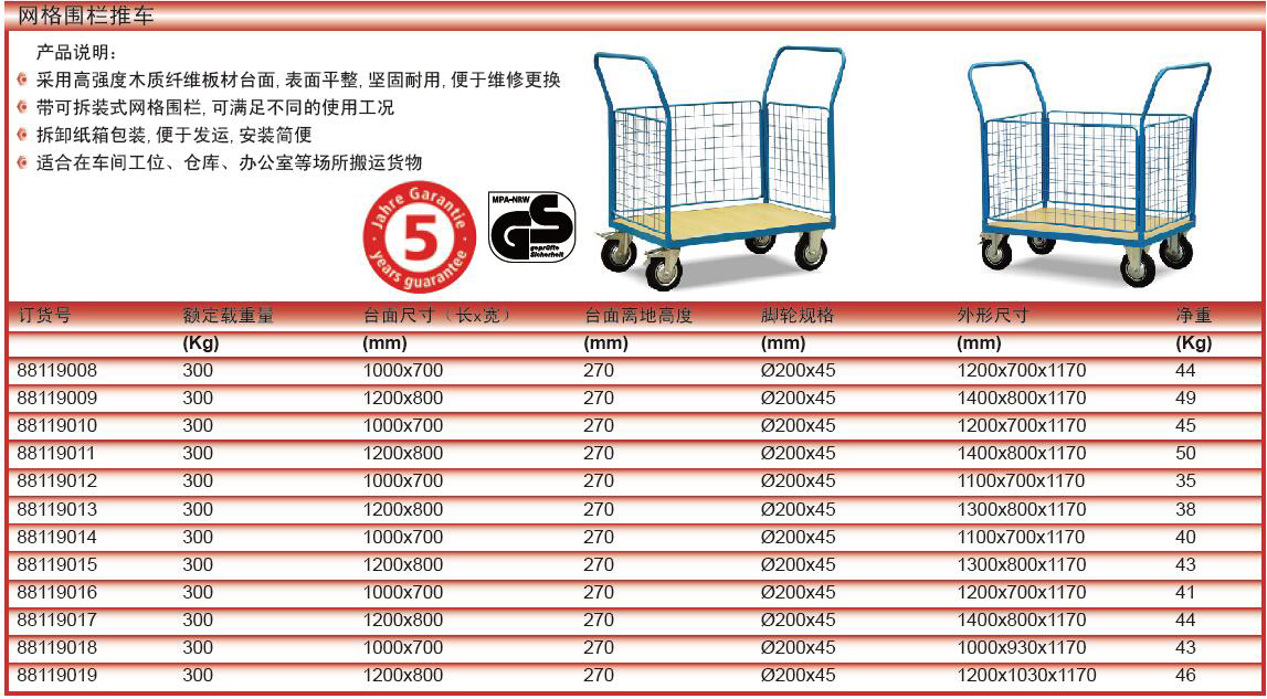 ·产品说明:采用高强度木质纤维板材台面,表面平整,坚固耐用,便于维修更换带可拆装式网格围栏,可满足不同的使用工况拆卸纸箱包装,便于发运,安装简便 ·适合在车间工位、仓库、办公室等场所搬运货物