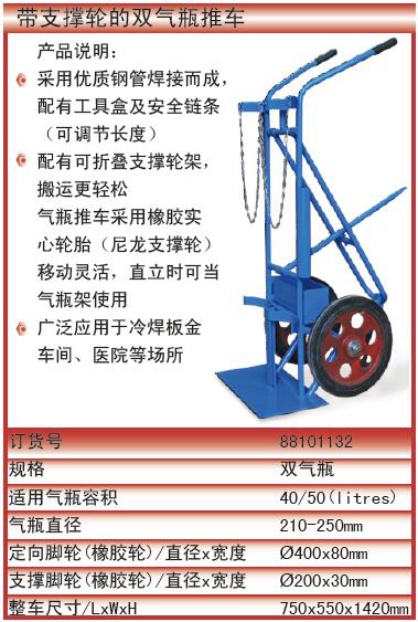 ·产品说明:采用优质钢管焊接而成,配有工具盒及安全链条(可调节长度)配有可折叠支撑轮架,搬运更轻松气瓶推车采用橡胶实心轮胎(尼龙支撑轮)移动灵活,直立时可当气瓶架使用