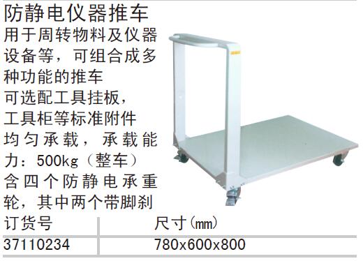 ·用于周转物料及仪器设备等,可组合成多种功能的推车 ·可选配工具挂板, ·工具柜等标准附件 ·均匀承载, 承载能力:500kg(整车) ·含四个防静电承重轮,其中两个带脚刹