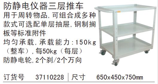 ·防静电仪器三层推车 ·用于周转物品,可组合成多种 ·款式可选配单层抽屉,钢制搁 ·板等标准附件 ·均匀承载,承载能力: 1 5 0 k g(整车),每50kg(每层) ·防静电轮,2个刹/2个万向