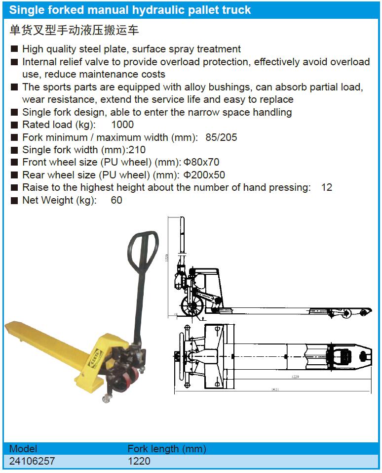 Single forked manual hydraulic pallet truck