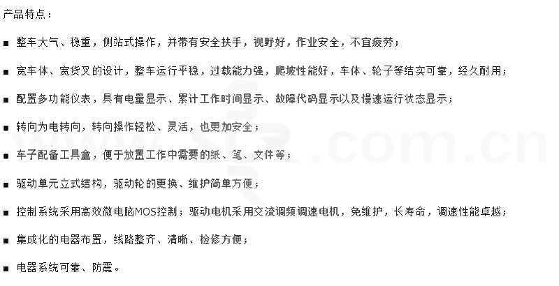 ·整车大气、稳重、侧站式操作,并带有安全扶手,视野好,作业安全,不易疲劳·宽车体、宽货叉设计,整车运行平稳,过载能力强,爬坡性能好,车体,轮子等结实可靠,经久耐用·配置多功能仪表,具有电量显示、累计工作时间显示、故障代码显示以及慢速运行状态显示·转向为电转向,转向操作轻松,灵活、也更加安全·车子配备工具盒,便于放置工作中需要的纸、笔、文件等·驱动单元立式结构,驱动轮的更换、维护简单方便·控制系统采用高效微电脑MOS管控制,驱动电机采用交流调频调速