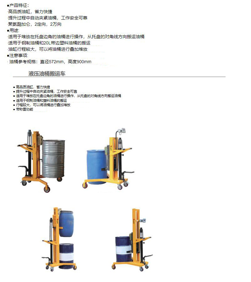 ·高品质油缸,省力快捷 ·提升过程中自动夹紧油桶,工作安全可靠 ·聚氨酯加仑,2定向,2万向