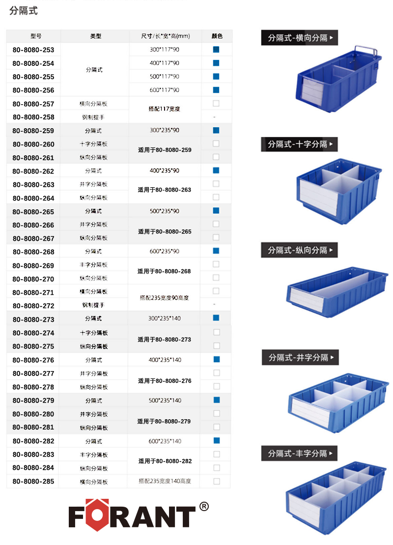 订货号 制造商型号 外形尺寸(长×宽×高) 最多可用横/纵分数隔片 颜色 内径尺寸(长×宽×高) 价格 购物车