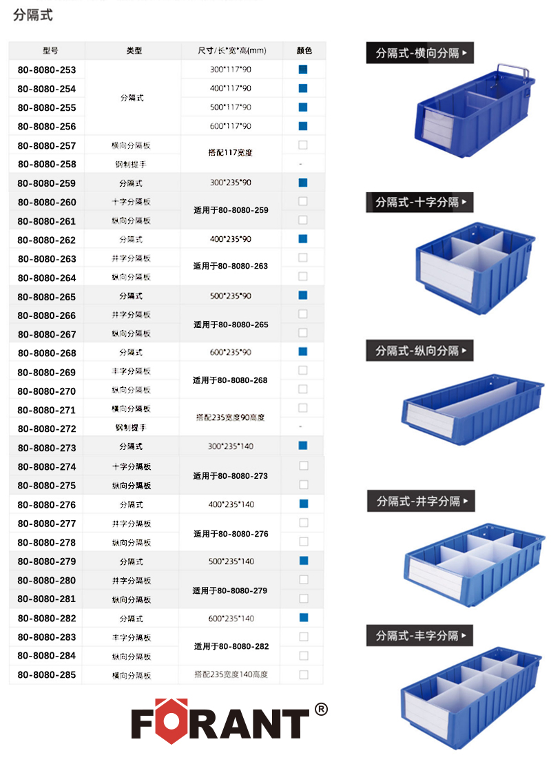 订货号 制造商型号 外形尺寸(长×宽×高) 最多可用横/纵分数隔片 颜色 内径尺寸(长×宽×高) 价格 购物车
