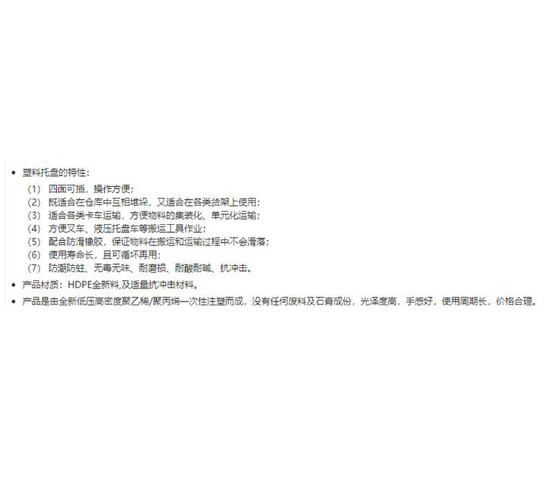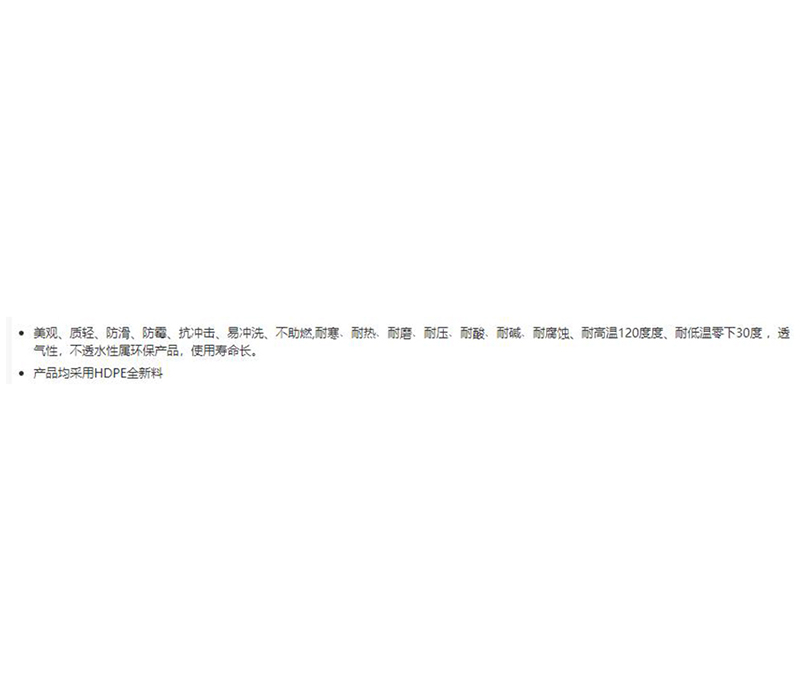 ·美观、质轻、防滑、防霉、抗冲击、易冲洗、不助燃,耐寒﹑耐热﹑耐磨﹑耐压﹑耐酸﹑耐碱﹑耐腐蚀、耐高温120度度、耐低温零下30度,透气性,不透水性属环保产品,使用寿命长。 ·产品均采用HDPE全新料。