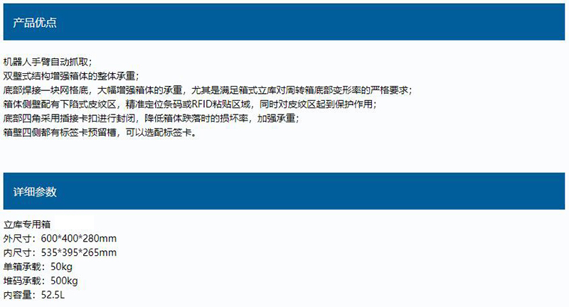 ·材质为共聚丙烯、聚乙烯合成 ·自重轻,使用寿命长 ·与各类物流器具在使用过程中尺寸配合完好 ·适用环境温度为-25℃~40℃ ·可堆叠存放,节省使用空间 ·可根据客户需求定制为防静电