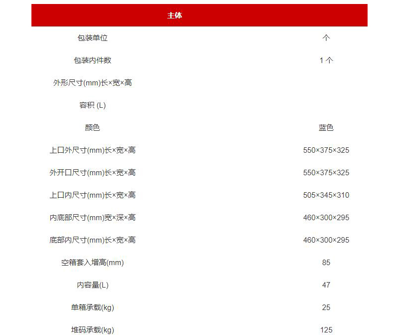 订货号 制造商型号 外形尺寸(长×宽×高) 颜色 内径尺寸 材质 单箱承重 堆码承重 价格 购物车