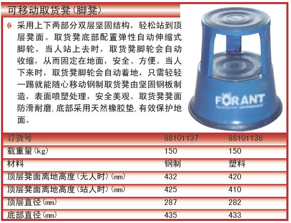 ·采用上下两部分双层坚固结构,轻松站到顶层凳面。 ·取货凳底部配置弹性自动伸缩式脚轮,当人站上去时,取货凳脚轮会自动收缩,从而固定在地面,安全、方便。 ·当人下来时,取货凳脚轮会自动着地,只需轻轻一踢就能随心移动钢制取货凳由坚固钢板制造,表面喷塑处理,安全美观。 ·取货凳凳面防滑耐磨,底部采用天然橡胶垫,有效保护地面。