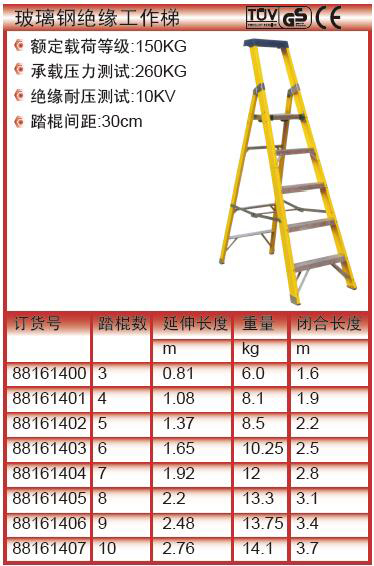 ·额定载荷等级:150KG ·承载压力测试:260KG ·绝缘耐压测试:10KV ·踏棍间距:30cm
