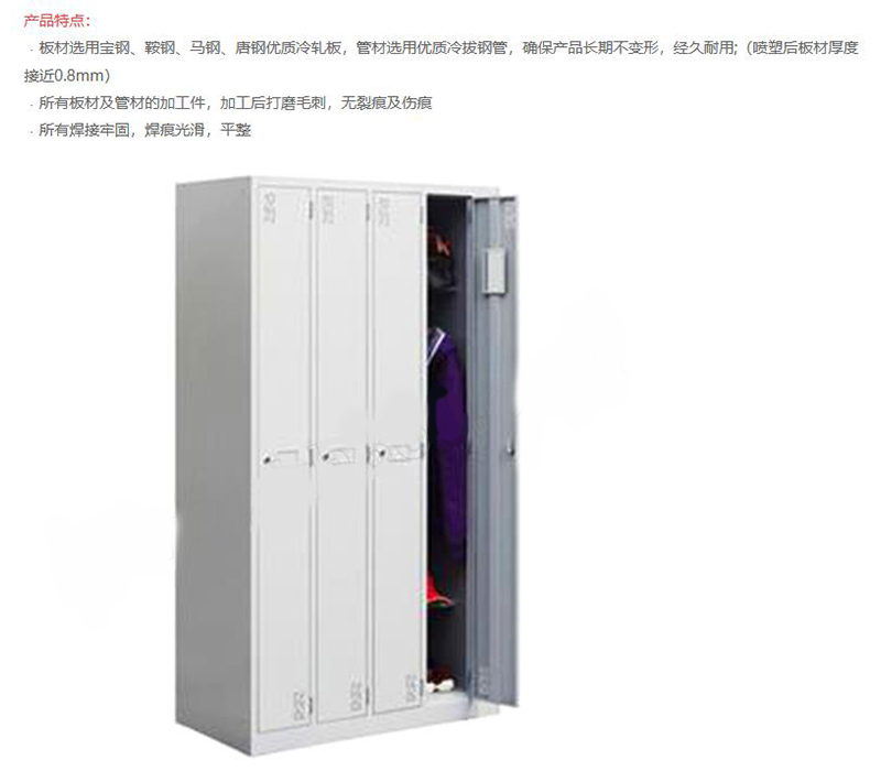 ·板材选用宝钢、鞍钢、马钢、唐钢优质冷轧板,管材选用优质冷拔钢管,确保产品长期不变形,经久耐用,(喷塑后板材厚度接近0.8mm) ·所有板材及管材的加工件,加工后打磨毛刺,无裂痕及伤痕 ·所有焊接牢固,焊痕光滑,平整