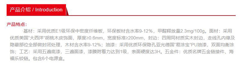 ·基材:采用优质E1级“福人”环保中密度纤维板,环保板材含水率9~12%,甲醛释放量2.3mg/100g ·面材:采用优质美国“大西洋”胡桃木皮饰面,厚度≥0.6mm,宽度标准≥200mm ·封边:四周同材质实木封边,走线孔内缘及隐蔽部位全部做封闭处理,木材含水率9~12% ·油漆:采用优质环保隐孔亚光德国“易涂宝”PU油漆,双面均衡涂饰 ·工艺:采用五遍底漆,三遍面漆,漆膜附着力达到1级,表面硬度达3H ·五金件:优质名牌五金链接件、海福乐铰链,包含6个电源盒