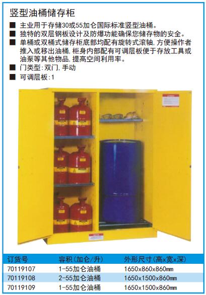 ·主业用于存储30或55加仑国际标准竖型油桶。 ·独特的双层钢板设计及防爆功能确保您储存物的安全。 ·单桶或双桶式储存柜底部均配有旋转式滚轴,方便操作者推入或移出油桶,柜身内部配有可调层板便于存放工具或油泵等其他物品,提高空间利用率。 ·门类型:双门,手动 ·可调层板:1