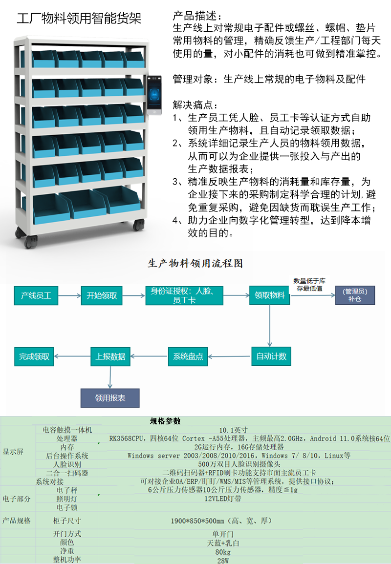 "1、生产员工凭人脸、员工卡等认证方式自助领用生产物料,且自动记录领取数据;