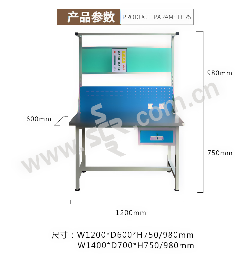 ·桌架40×40×1.2方管,桌面优质防冲压30mm,轻型吊一抽,承重30kg。背板左方孔,右百叶孔,上配工艺看板,日光灯。