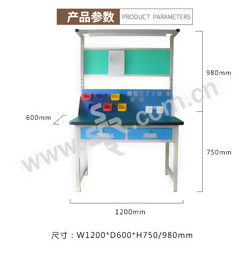 ·桌架40×40×1.2方管,桌面优质防冲压30mm,轻型吊一抽,承重30kg。背板左方孔,右百叶孔,上配工艺看板,日光灯。