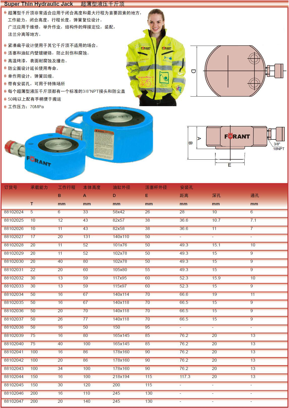 ·每个超薄型液压千斤顶都有一个标准的3/8”NPT接头和防尘盖