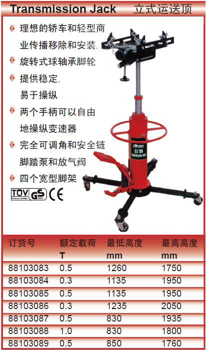 ·理想的轿车和轻型商业传播移除和安装. ·旋转式球轴承脚轮 ·提供稳定, ·易于操纵 ·两个手柄可以自由地操纵变速器 ·完全可调角和安全链 ·脚踏泵和放气阀 ·四个宽型脚架
