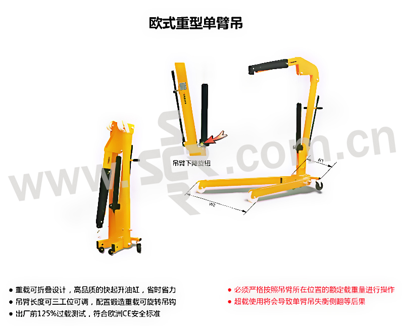 ﹒重载设计,高品质的快起升油缸,省时省力 ﹒根据需要.吊臂可三个工位调节 ﹒锻造重载可旋转吊钩 ﹒出厂前125%过载测试,保证安全使用 ﹒符合欧洲CE安全标准