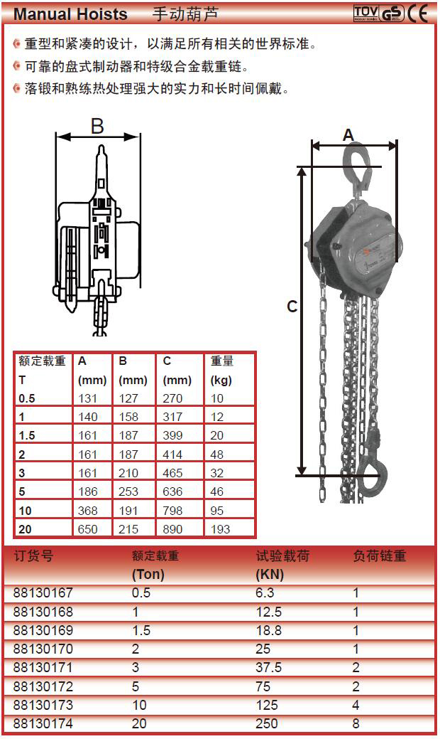 ·重型和紧凑的设计,以满足所有相关的世界标准。 ·可靠的盘式制动器和特级合金载重链。 ·落锻和熟练热处理强大的实力和长时间佩戴。