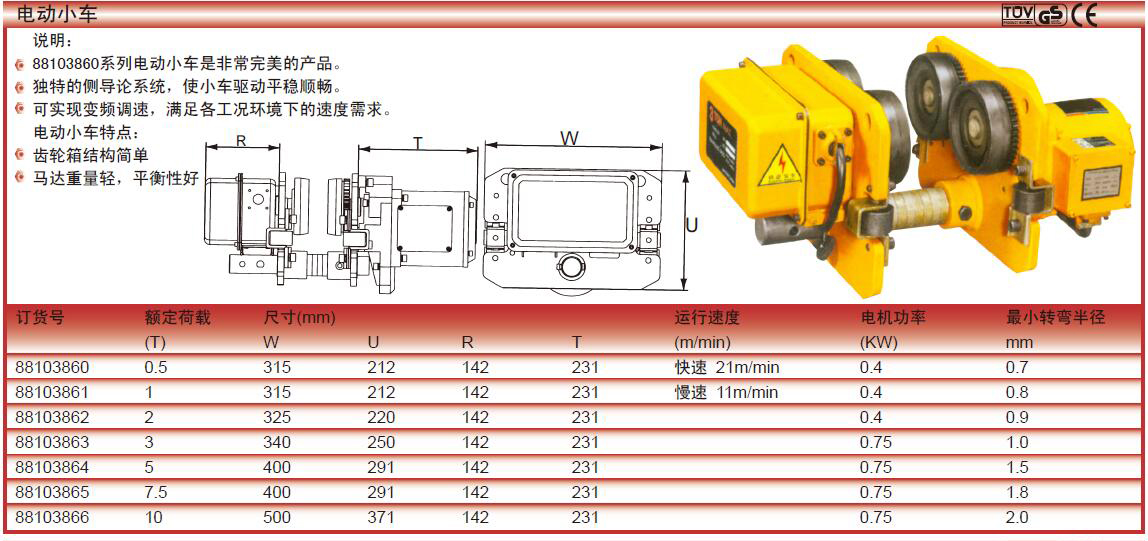 ·88103860系列电动小车是非常完美的产品。 ·独特的侧导论系统,使小车驱动平稳顺畅。 ·可实现变频调速,满足各工况环境下的速度需求。 ·电动小车特点:齿轮箱结构简单马达重量轻,平衡性好