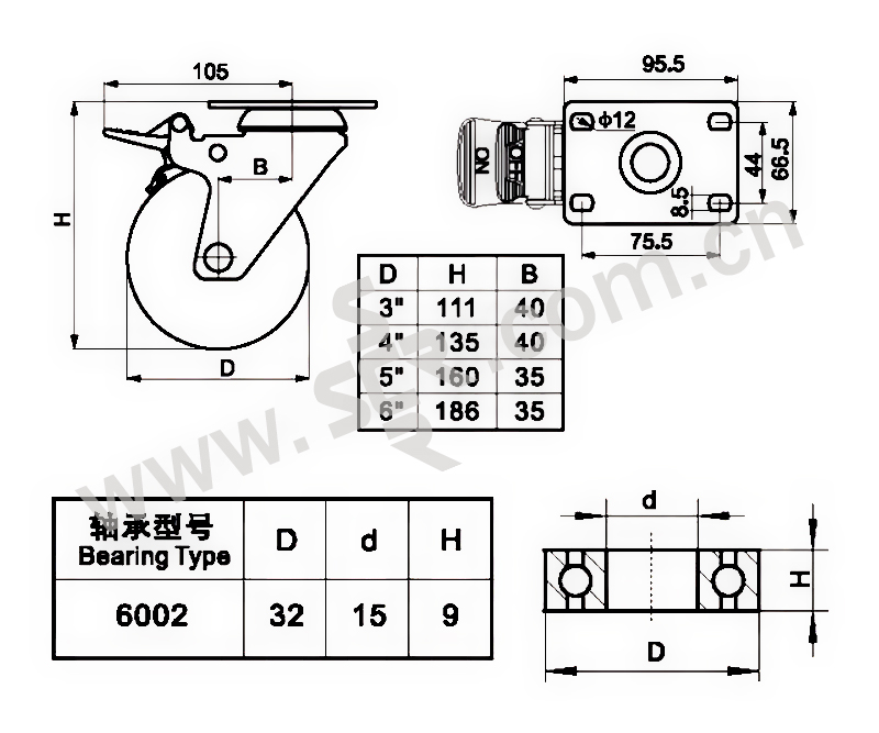 EDL/易得力 镀锌6寸平顶刹车高强度聚氨酯TPU脚轮 57126H-576-87 载重130kg 底板规格95.5×66.5mm 安装高度186mm 1只